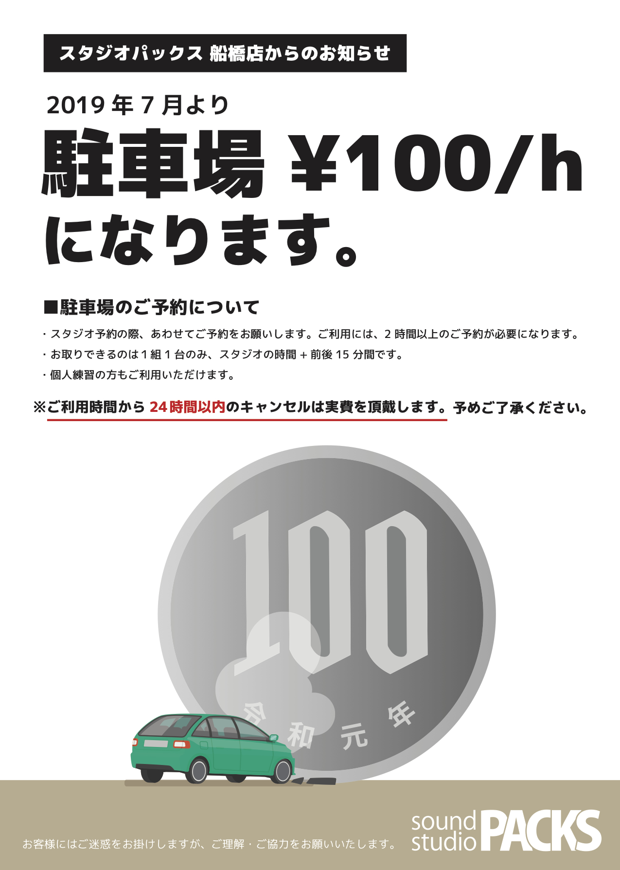 2019年7月1日より、船橋店の専用駐車場が有料(¥100/H)となります。